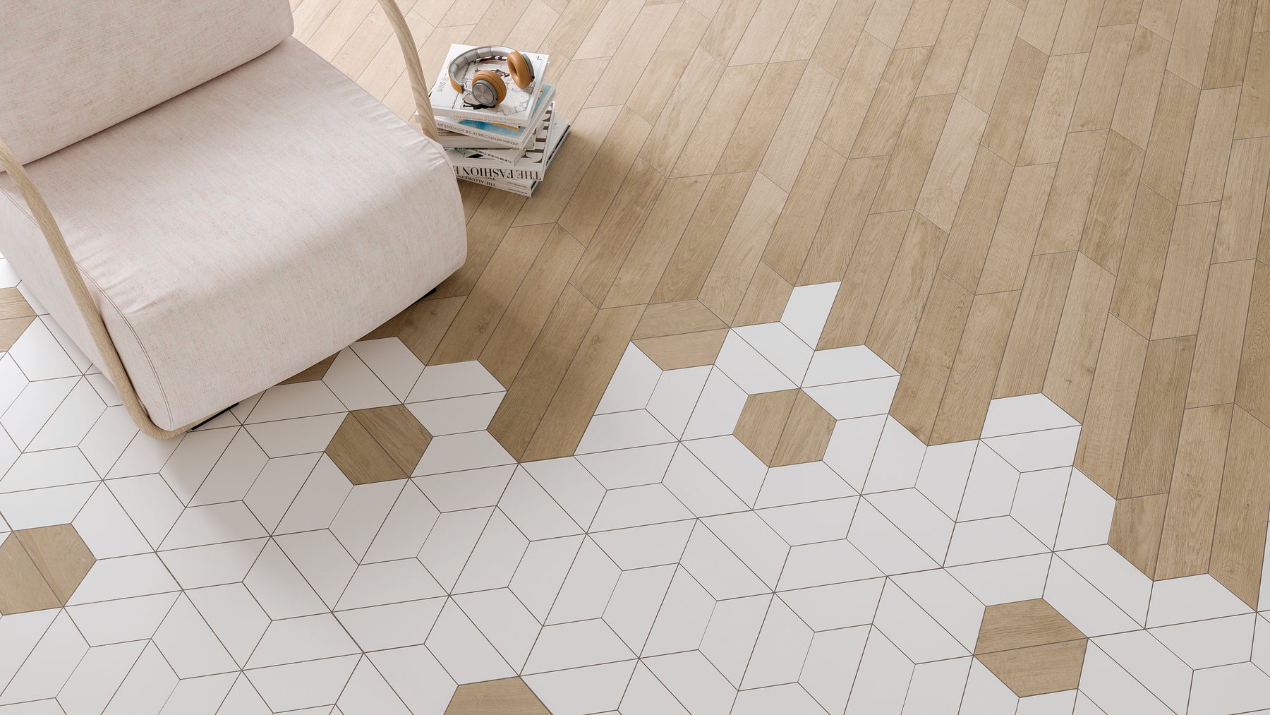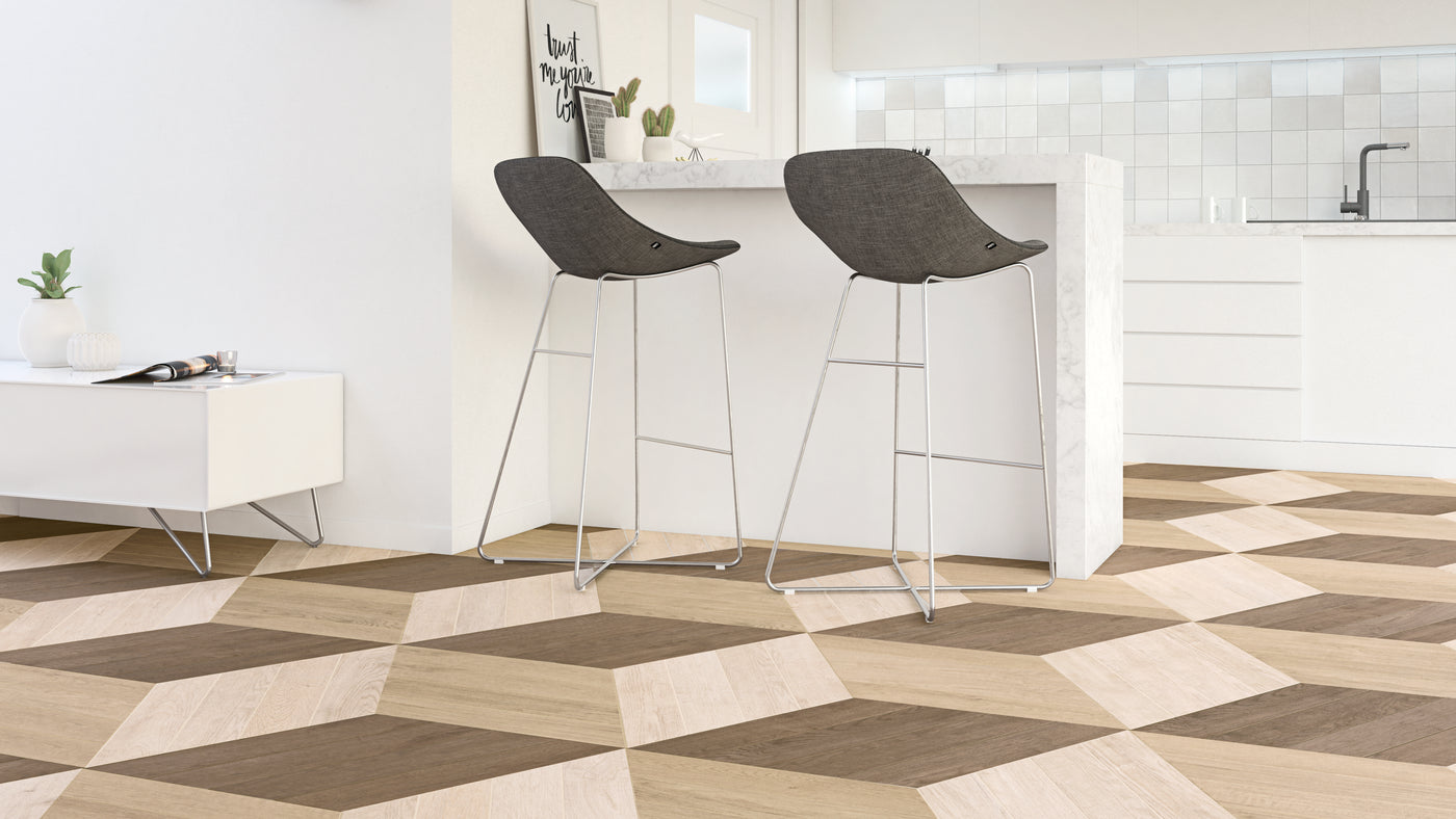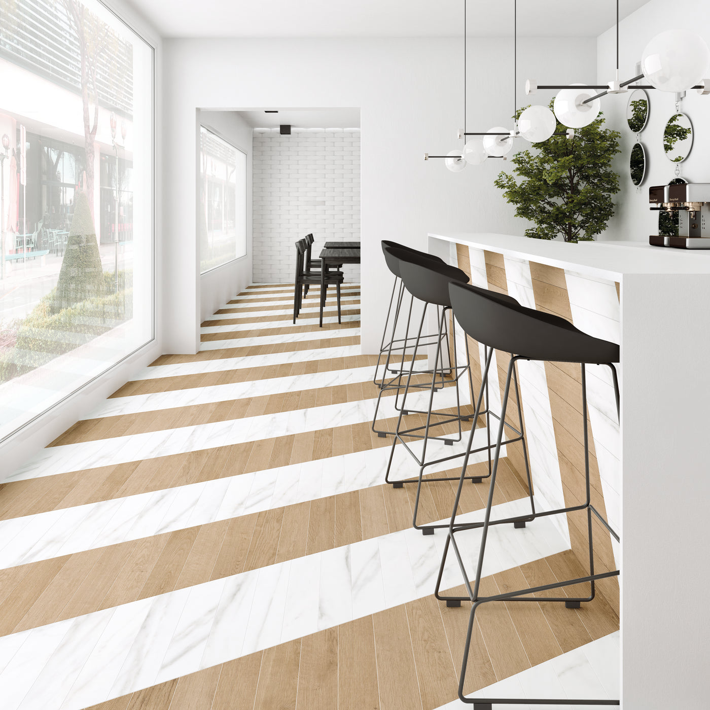 3 natural wooden tones and a calacatta inspired stone conforming the unusual elegance of Banu Chevron B.