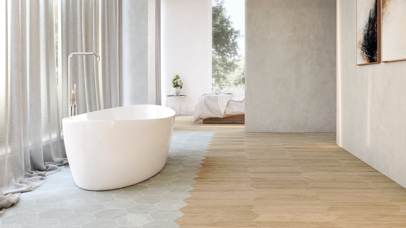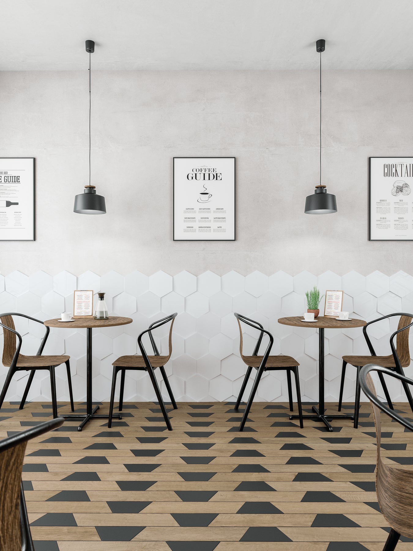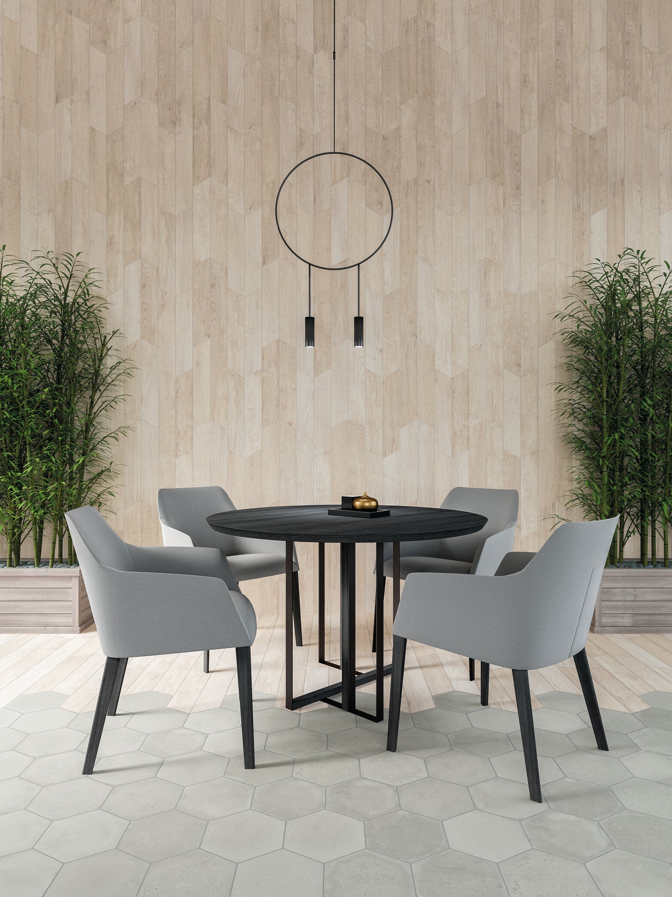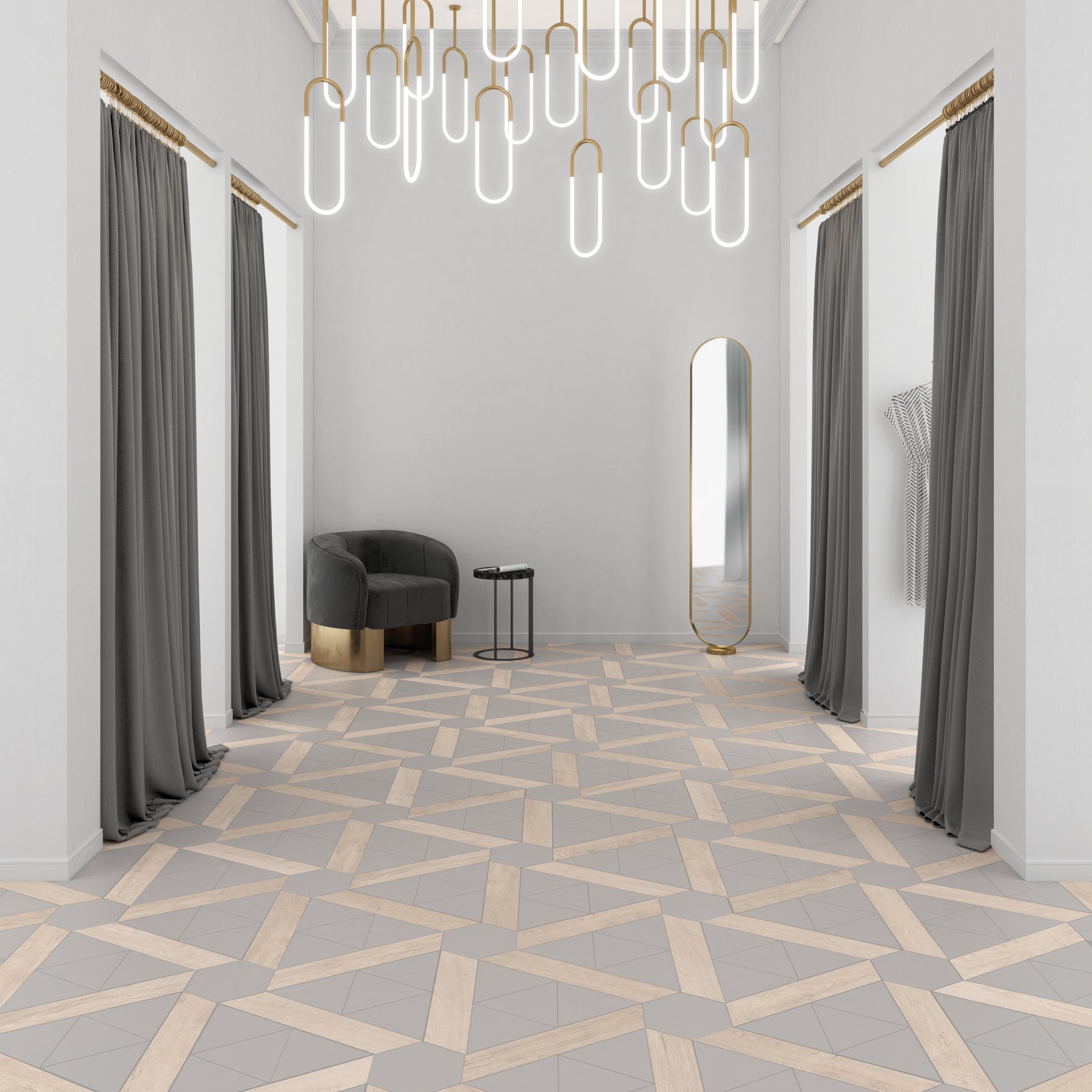 3 natural wooden tones and a calacatta inspired stone conforming the unusual elegance of Banu Chevron B.