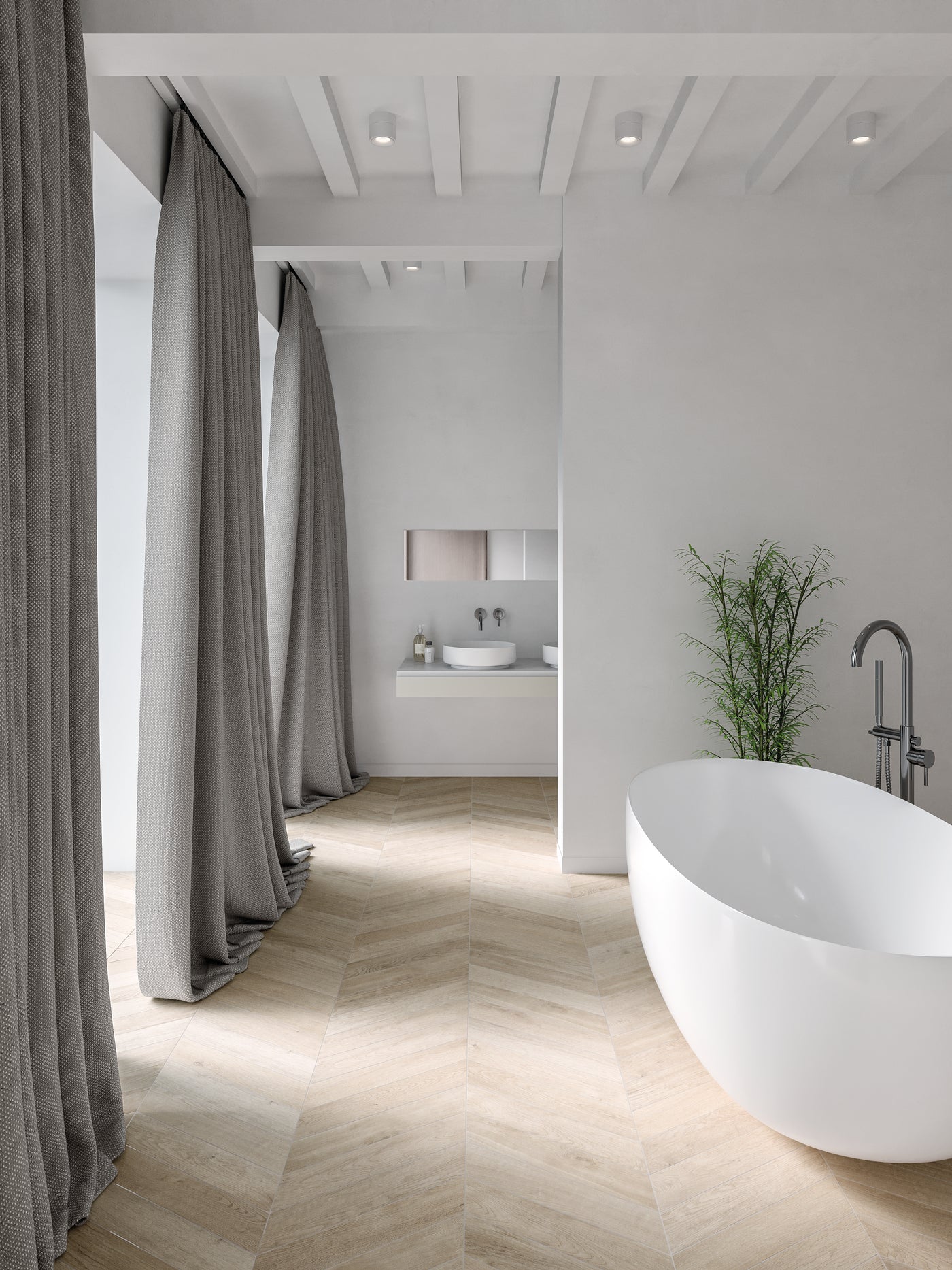 A fluid dialogue between the wood and the stone, that allows open plan stays with floors smoothly blended without room dividers.