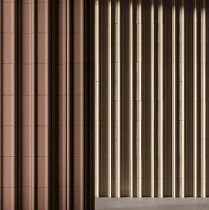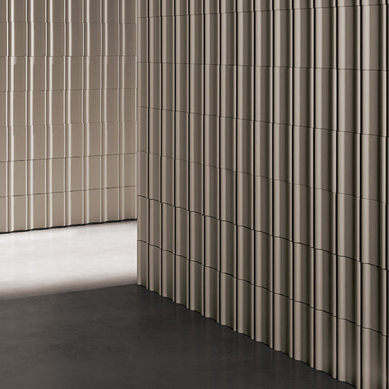 Ringo is a sculptural terracotta element defined by its architectural geometry and softened cylindrical edges. Its rhythmic vertical form creates a tactile play of depth and shadow, bringing warmth, texture, and a refined masonry-inspired presence to interior spaces.