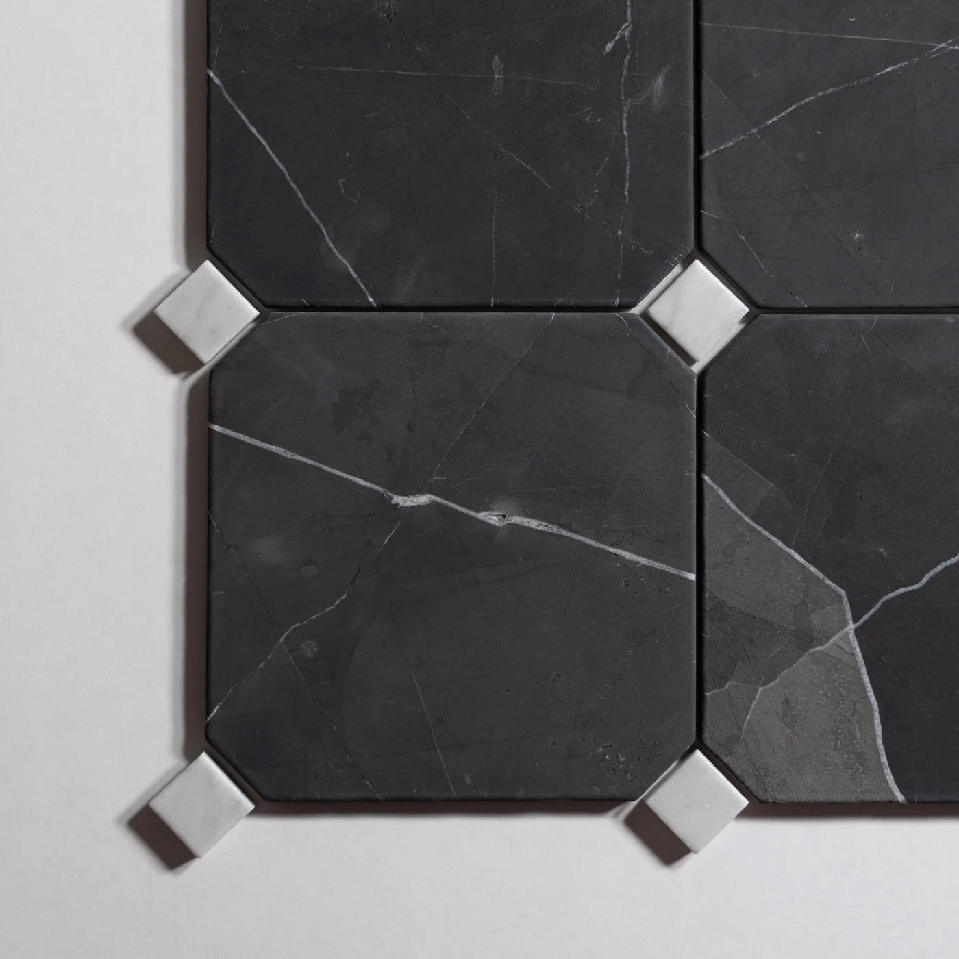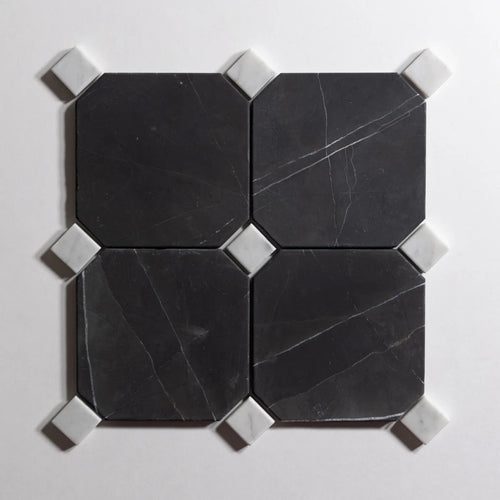 Georgina Octagon Tumbled – This refined marble mosaic features Nero St. Gabriel's deep black tones in a classic 6"x6" or 8"x8" octagonal shape with a tumbled finish. The tumbled texture adds a rustic charm, making it ideal for vintage-inspired or Mediterranean-style interiors. Perfect for floors, walls, and backsplashes, this collection brings timeless elegance and understated luxury to any space.