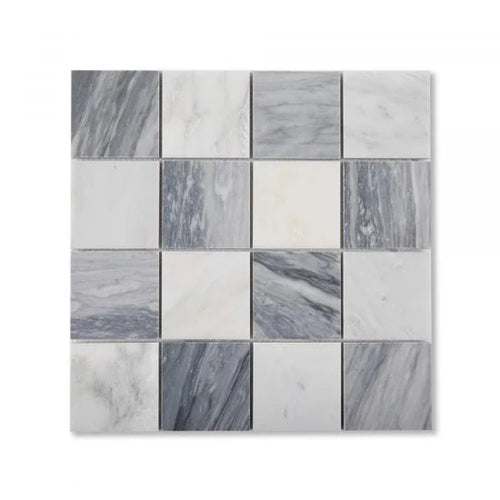 The Princess Bianca and Bottega Checkerboard Mosaic features a sophisticated blend of white and grey marble, creating a stunning checkerboard pattern. Each tile is precisely honed for a smooth, matte finish that enhances the natural veining and subtle texture of the stone. This mosaic tile comes in 12"x12" sheets of 1" or 3” tiles.